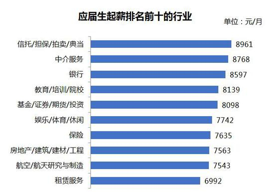 应届生起薪排名靠前的行业有哪些?《报告》显示,信托/担保/拍卖/典当、中介服务、银行等行业起薪排名靠前,分别为8961元,8768元和8597元。除此之外,教育/培训/院校、娱乐/体育/休闲等受益于直播经济的带动和数字化的发展,也向应届生开出了相对高的薪酬。