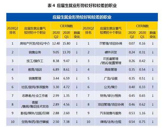 房地产开发/经纪/中介、销售业务、技工/操作工、教育/培训、销售管理等。其中,地产中介、销售、技工/操作工等职业的工作性质或内容较单一,技术含量不高,薪酬待遇对于应届生求职者的吸引力较小,因此出现较大的供给缺口。