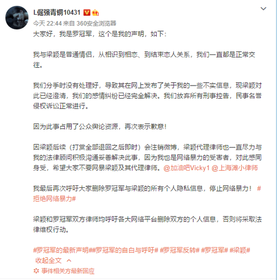 5日晚,罗冠军也发声明,称放弃所有刑事控告,民事名誉侵权诉讼正常进行