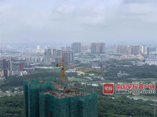 ▲9月13日,雨后的南宁市青秀区气温凉爽。午间时分,长虹路一楼盘工人在施工。(邹财麟 摄)