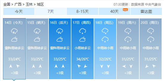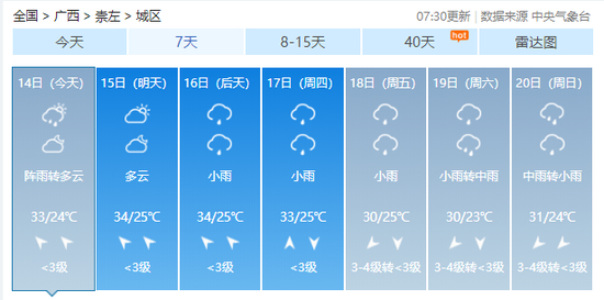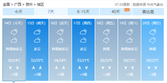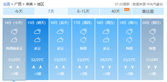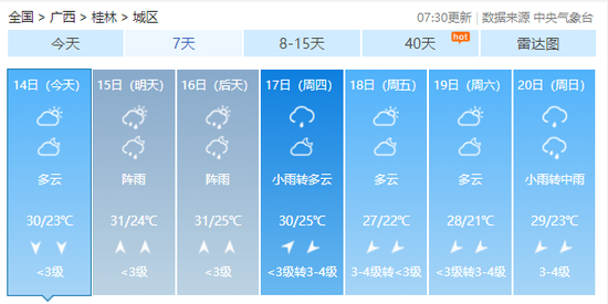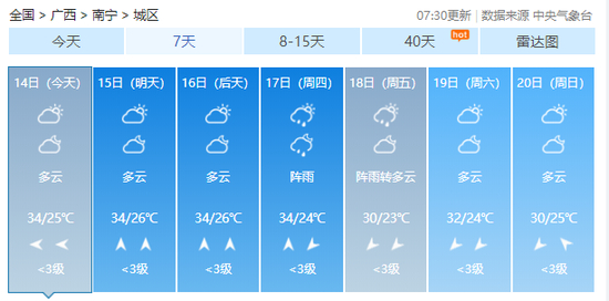 今明两天广西受副高控制和低层偏南气流影响大部多云到阴天有阵雨或雷雨袭扰同时气温有所回升全区大部最高气温将处在30~34℃之间天气以少雨晴热为主