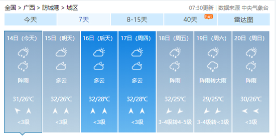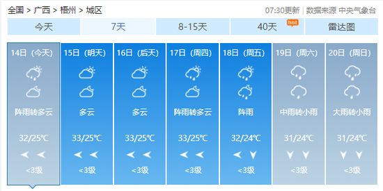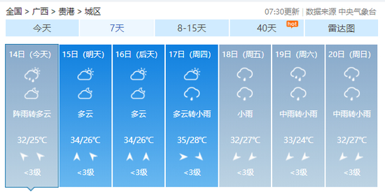 今天(14日)上午全区大部没有出现明显降雨。11时大部气温23~30℃,体感还算比较舒适。预计今天晚上和明天白天,全区阴天到多云大部有阵雨或雷雨,局部大雨。大家外出需注意备好雨具。