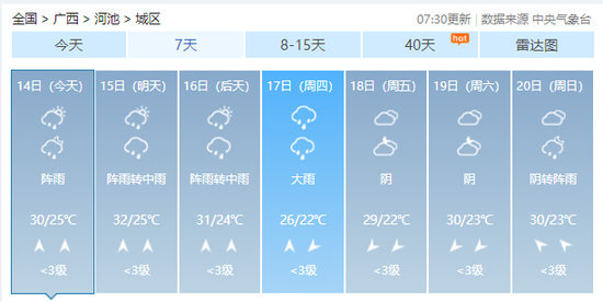 17日,桂西北部分地区有中雨,局部暴雨,我区其它地区有阵雨或雷雨,局部大雨。