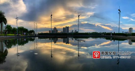 ▲9月12日下午6时许,南宁市天空彩霞万丈,倒映在滨湖广场喷泉池内。(邹财麟 摄)