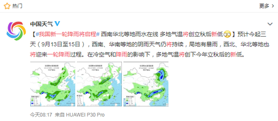西南、华南等地的阴雨天气仍将持续,西北、华北等地也将迎来一轮降雨过程。在冷空气和降雨的影响下,多地气温将创下今年立秋后的新低。