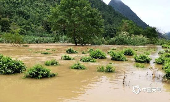9月11日晚至12日,河池市金城江区遭遇强降雨,九圩镇三旺社区新洞柑橘种植产业示范点附近河水暴涨,大片柑橘被淹没在一片汪洋之中。(韦家宝 摄)