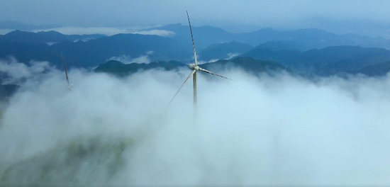 日前,记者到玉林采访拍摄,登上桂东南第一高峰大容山,正巧在雨后遇上了云海奇观。在主峰莲花山顶峰,云雾翻滚,波澜壮阔,与山顶上巨大的风电扇叶搭配,仿佛置身于天宫仙境,蔚为壮观。(冯耀华 摄)