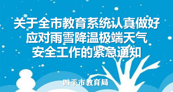 根据吉林省气象局预测,受江淮气旋北上影响,近日我省将出现罕见的强雨雪冰冻和大风降温天气过程。为贯彻落实省教育厅有关工作要求,全力做好我市教育系统应对强雨雪大风冰冻天气安全工作,确保师生人身安全,11月19日,四平市区全部校车停运,初中、小学、幼儿园停课一天,各县(市)区教育局结合实际参照执行。