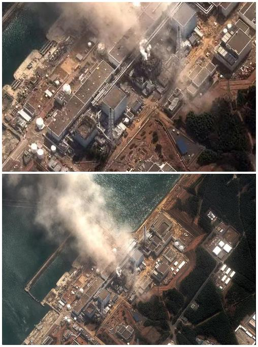 2011年3月19日和2019年3月9日拍摄的日本福岛第一核电站卫星照片,对比明显。卫星数据来源:MAXAR
