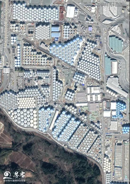 为了储存核污水,东京电力共准备了约1000个储水罐,目前9成已装满。所有储水设施的总容量约为137万吨,预计到2022年秋季达到极限。成千上万个密密麻麻的圆形储水罐在厂区内摆放着,用卫星图就能明显观察到。