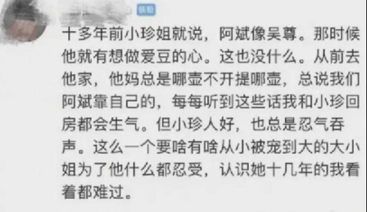 朱小贞初中时的照片曝光,眉目清秀,气质清澈。一个从小被宠到大的大小姐,为了林生斌什么委屈都能忍受,朱小贞的朋友都替她难过,林生斌的父母也不是省油的灯,夫妻俩每次回家,他们都会强调儿子能有今天,都是靠自己的。如果没有朱小贞,没有朱家父母和哥哥的帮衬,他怎么可能有今天,可现在他做了什么?