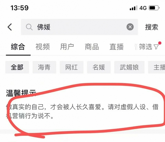 ↑当抖音用户搜索“佛媛”时,搜索结果页会提示“做真实的自己”
