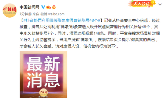 共处罚利用“佛媛”形象营造人设开展虚假营销行为相关账号48个,其中永久封禁账号7个,同时,清理违规视频148条。