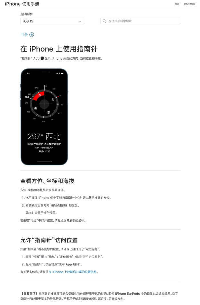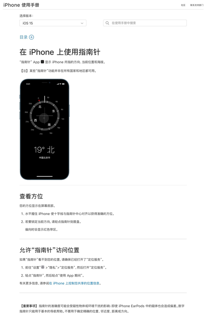 对比以上两张图片中的描述还可以发现,更新后,iPhone 使用手册中给出了注释,显示为:某些“指南针”功能并非在所有国家和地区都适用。