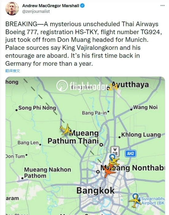宫中的消息人士称,泰王及其随从人员都在这架飞机上,注意,这是泰王自去年10月返回泰国后,第一次出境飞往德国。