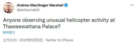 英国记者在推特上问,有没有人发现在Thaweewattana宫附近有不寻常的直升机活动?