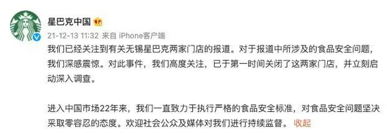 12月13日,@星巴克中国 发布声明称,“我们已经关注到有关无锡星巴克两家门店的报道。对于报道中所涉及的食品安全问题,我们深感震惊。”星巴克称,已于第一时间关闭这两家门店,并立刻启动深入调查。