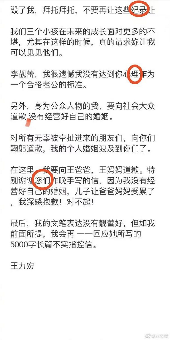 九派新闻注意到,王力宏短短的1400字回应,错别字、标点、逻辑“漏洞百出”,有网友留言质疑“憋了一天就这,歌词是你自己写的么?”。