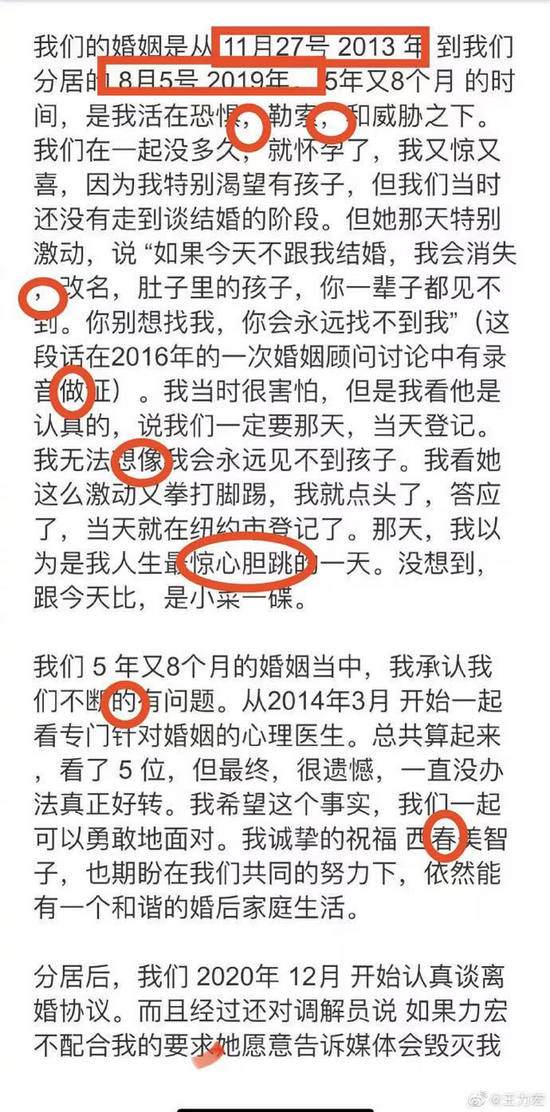在王力宏发的第二张图里,“我们的婚姻是从11月27号2013年到我们分居的8月5号2019年。”时间语序真的很美式了,不符合中文习惯,大约是因为他曾长期在国外学习、生活吧。