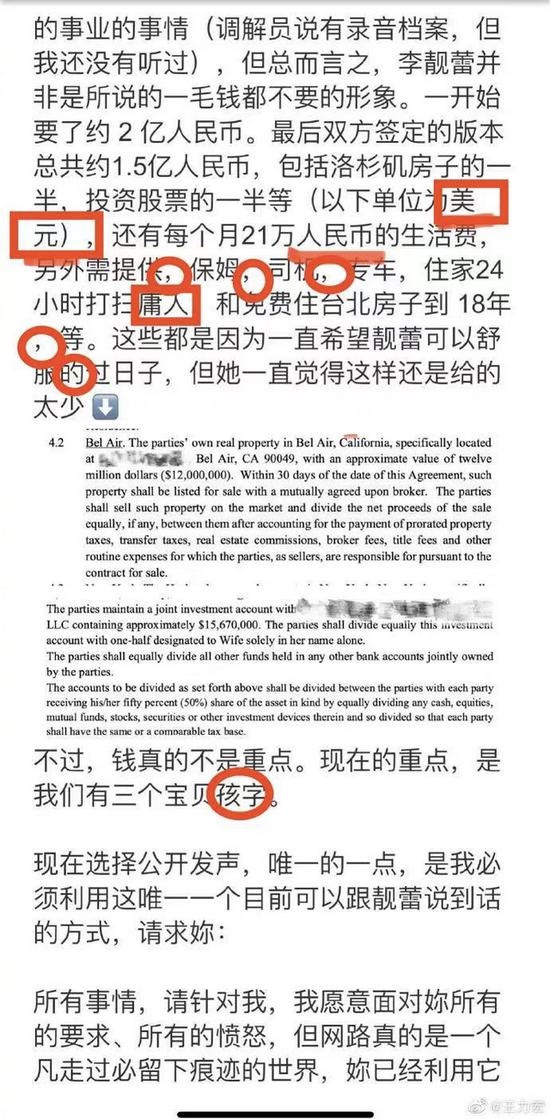 提到钱的部分,王力宏也是逻辑混乱,人民币美元交代不清:最后双方签定的版本总共约1.5亿人民币,包括洛杉矶房子的一半,投资股票的一半等(以下单位为美元),还有每个月21万人民币的生活费……