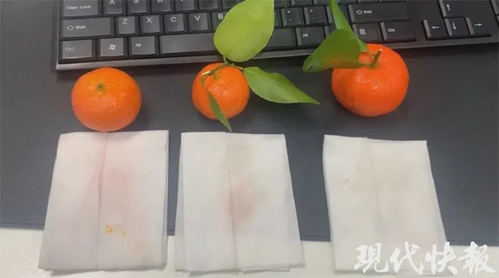 随后现代快报记者又陆续探访三家水果店发现,其中一家擦拭后有浅黄色出现,并未变红,剩余两家并未变色。几家水果店老板均表示,如果买到掉色的砂糖橘,可能是由于打蜡造成的,出现橘黄色可能是擦破表皮了,大部分的砂糖橘擦拭后不会有颜色。记者又拿出之前在超市购买的砂糖橘进行擦拭,发现湿巾没有什么颜色的变化。