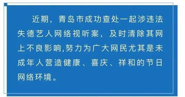 据“青岛文化执法”微信公众号消息,近期,青岛市成功查处一起涉违法失德艺人网络视听案。