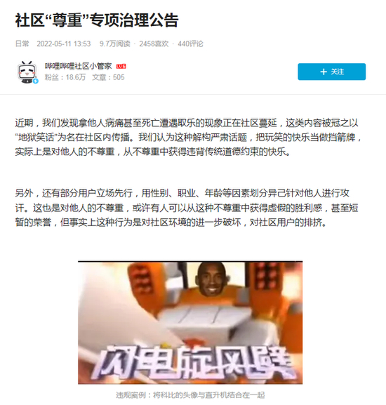 从5月10日起至今日,B站官方哔哩哔哩社区小管家接连发布四篇专项治理公告,开始对站内存在的多方面不良信息进行集中治理,其中包括打击涉疫谣言、网暴,打击恶意炒作炫富,打击涉疫医护人员网暴言论和“地狱笑话”,其中尤其以“地狱笑话”这条治理公告引起了人们的讨论。