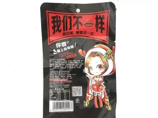 另有,广西柳城县市场监管局接到匿名举报,某中学路口某饮食店,销售外包装印有不雅内容的食品。据了解,“你要爱上妾身哦”、“今夜我就是你的圣诞礼物,喜欢吗?”等语句便印在该食品包装上。