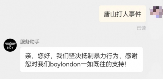 目前,品牌方已将#唐山打人事件#等关键词设置成自动回复,称“坚决抵制暴力行为。”