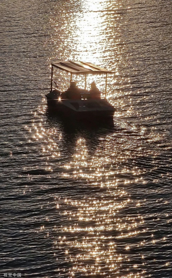 牡丹江市的江面上,居民乘船赏玩