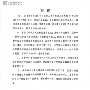 近日,前《谭谈交通》节目主持人谭乔在网上发布的《〈谭谈交通〉全网下架》视频,引发网络热议。受成都市广播电视台委托,四川君盛律师事务所杨志男、贺鹏飞律师,就《谭谈交通》节目著作权等相关事宜,特发布公开声明如下:
