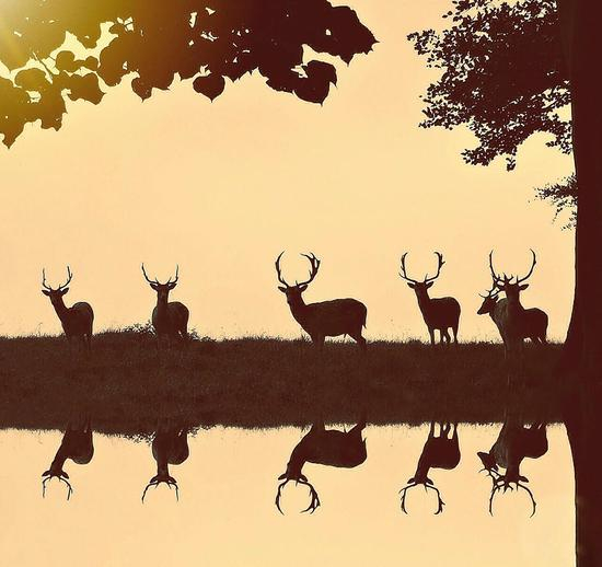 英国摄影师Paul Biggs在德比郡查茨沃思庄园拍到一群牡鹿在日出时分饮水的画面,熹微的晨光中,鹿群排队站立在德文特河畔,阳光将它们的影子映照在水面上,画面十分唯美。