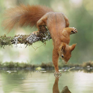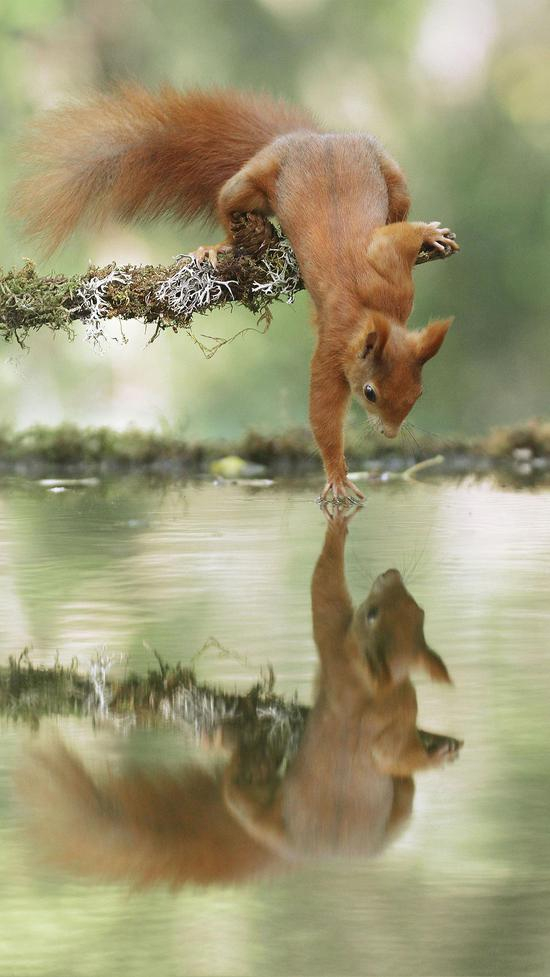 爱美之心人皆有之,奥地利这只小红松鼠也不例外,它把水面当镜子,狂凹造型自我欣赏停不下来。维也纳摄影师Julian Rad在外出时邂逅了这只爱臭美的小松鼠,它来到一个水池边解渴,平静的水面将它的身影完美的折射了出来。意识到水面上的影子就是自己后,这个小家伙显然是被自己美到了,开启了狂凹造型模式,它借助一根树枝当道具,各种秀柔软身姿,眼睛却一刻也没有离开水面,盯着自己美丽的倒影自我欣赏,画面十分逗趣。