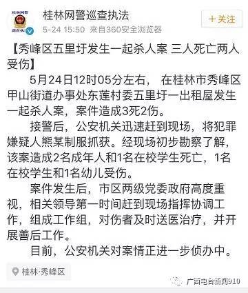 5月24日12时05分左右, 在桂林市秀峰区甲山街道办事处东莲村委五里圩一出租屋发生一起杀人案,案件造成3死2伤。