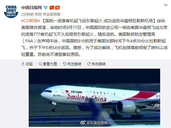 此前消息:国航一飞北京波音客机起飞后引擎起火 返航华盛顿
