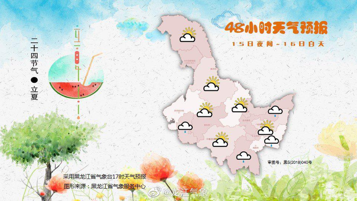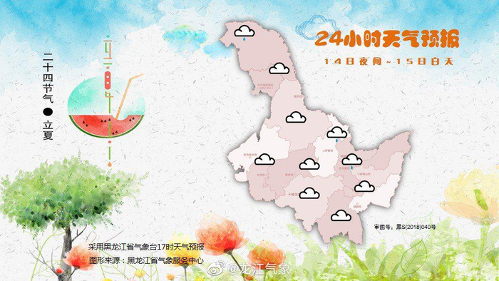 #小天报天气[超话]# 【#黑龙江# 晚间全省天气预报】黑龙江省气象台2020年5月14日17时发布14日夜间至17日白天全省天气预报: 14日夜间到15日白天:大兴安岭北部、伊春北部、鹤岗、佳木斯多云有阵雨或雷阵雨,其它地区多云。 另外,全省大部地区未来24小时仍处在大风蓝色预警信号中。未来三天北部林区有效降水少,森林火险气象等级依然较高,请注意预防。 15日夜间到16日白天:大庆、佳木斯、鸡西、牡丹江多云有阵雨或雷阵雨,其它地区晴有时多云。 16日夜间到17日白天:齐齐哈尔南部、绥化南部、大庆、哈尔滨、双鸭山、七台河、鸡西、牡丹江多云有阵雨或雷阵雨,其中哈尔滨东南部、牡丹江西部可达中雨,其它地区多云。 14日夜间最低气温:大兴安岭0~2℃,黑河、伊春、鹤岗3~5℃,其它地区11~13℃。 15日白天最高气温:大兴安岭北部13~15℃,大兴安岭南部19~21℃,黑河、伊春、鹤岗21~23℃,其它地区25~27℃。