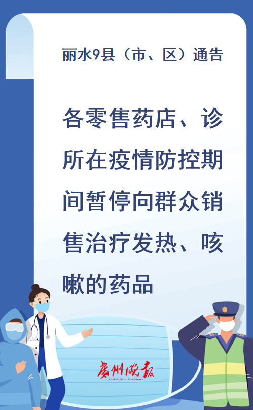 鉴于目前新型冠状病毒感染的肺炎疫情防控工作形势,为进一步加强对发热、咳嗽病人管理,莲都区疫情联防联控指挥部研究决定,即日起全区各零售药店、诊所在疫情防控期间暂停向群众销售治疗发热、咳嗽的药品,有发热、咳嗽等症状的群众一律引导至丽水市中心医院、丽水市人民医院、丽水市中医院及莲都区人民医院发热门诊就医,恢复时间另行通知。