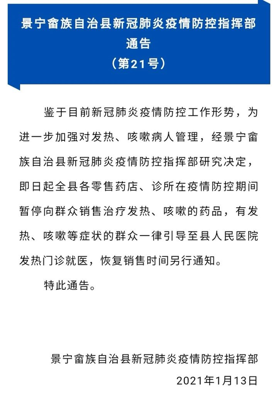 即日起全县各零售药店、诊所在冬春季和春节疫情防控期间暂停向群众销售治疗发热、咳嗽的药品