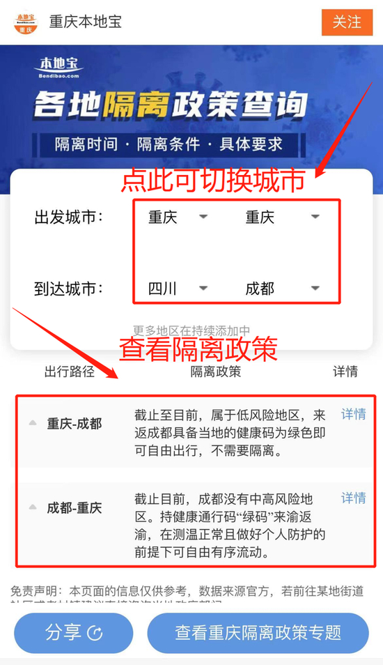 即可查看重庆往返四川成都的隔离政策