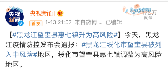 1月13日晚上,黑龙江省召开疫情防控新闻发布会 ,对疫情防控相关情况进行通报。黑龙江绥化市望奎县被列入疫情中风险地区,望奎县惠七镇调整为高风险地区。