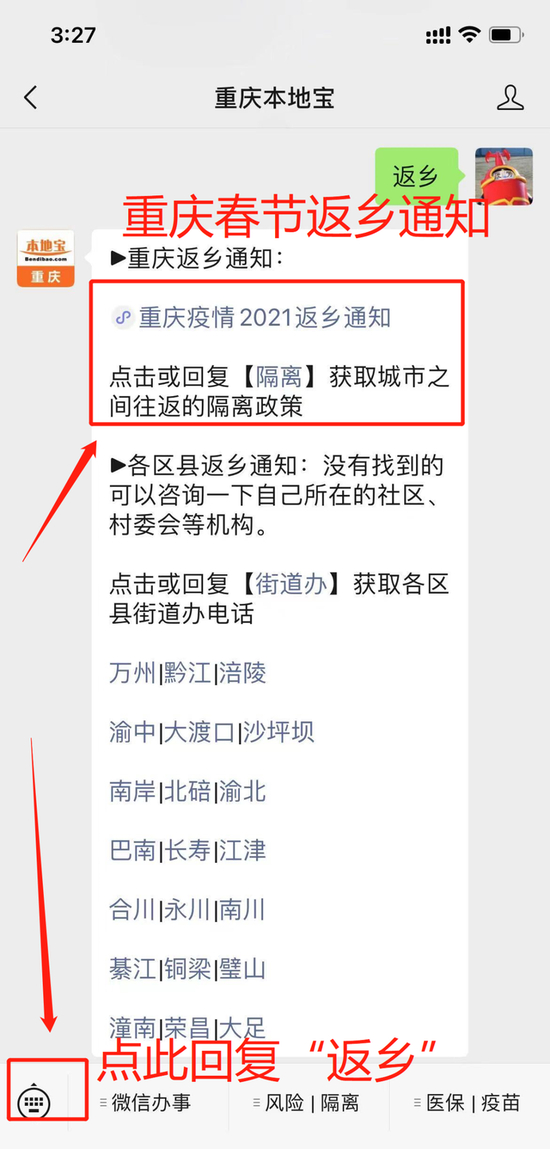 重要提示:疫情风险等级随疫情情况动态调整, 大家出行前可以在 [重庆本地宝] 微信对话框回复 [风险] 获取全国各地中高风险地区最新名单,还可以查询自己所在的地区是不是低风险地区哦!