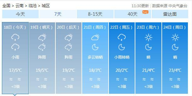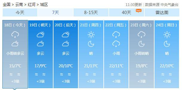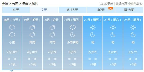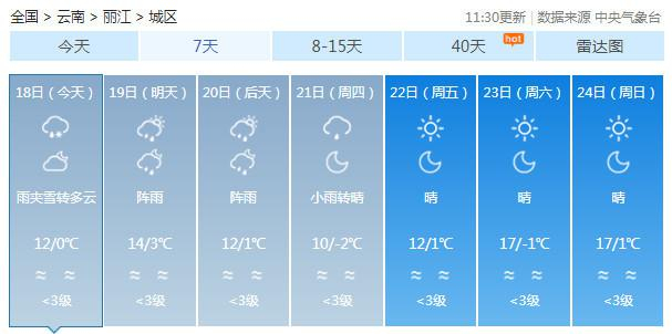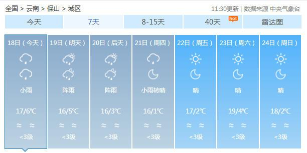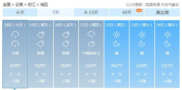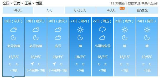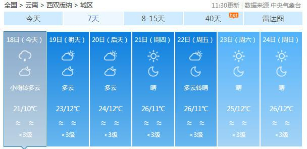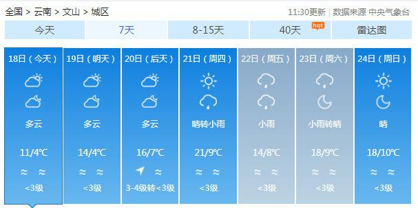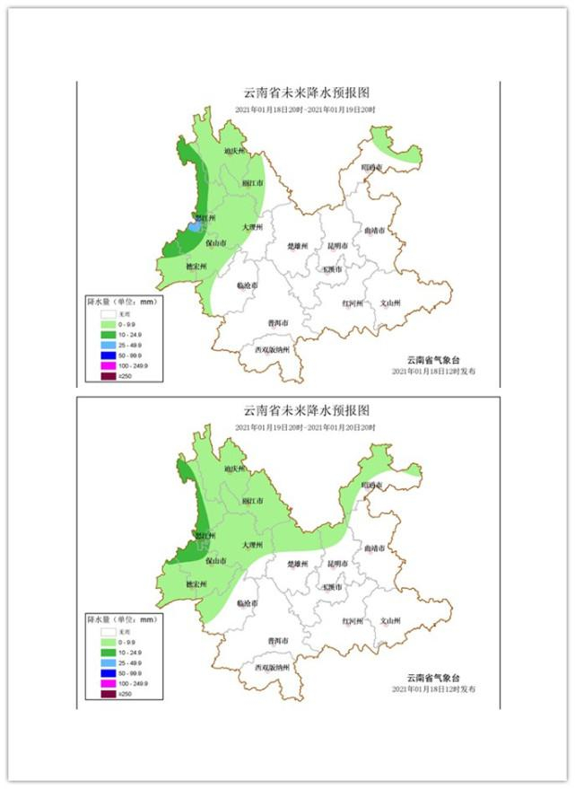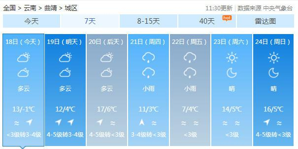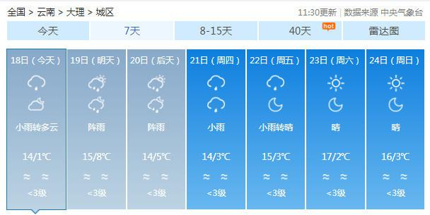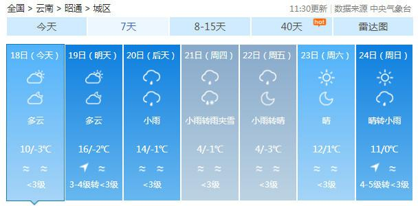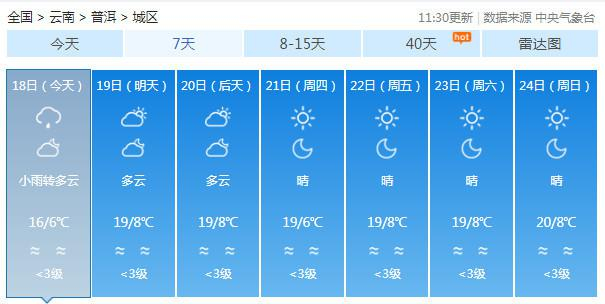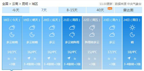 19-20日:迪庆中北部多云有阵雪,迪庆南部、丽江、怒江、大理、保山、德宏、楚雄、昆明北部多云有阵雨局部中雨,昭通、曲靖北部阴有小雨,其它地区多云。