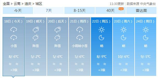 21日:迪庆中北部多云有阵雪,迪庆南部、丽江、怒江、大理、保山、德宏、楚雄、昆明北部、曲靖、昭通多云间阴有阵雨局部中雨,其中昭通高海拔地区有雨夹雪,其它地区多云。