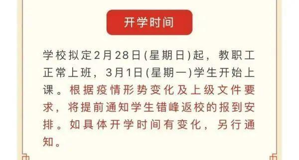 学校拟定2月28日起,教职工正常上班,3月1日学生开始上课。根据疫情变化及上级文件要求,将提前通知学生错峰返校的报到安排。如开学时间有变化,另行通知。