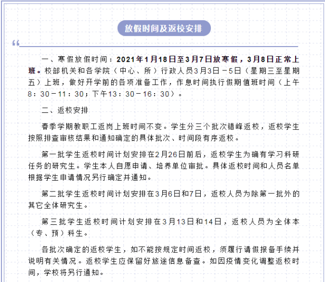 按照“错峰”原则,学生实行分批次有序放假离校和开学返校, 离校后非通知不返校,确需返校应提前申请。本科生、研究生离校、返校、注册、课程教学、毕业班学生体检等具体安排分别按相关规定及有关职能部门的通知执行