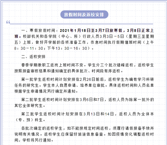 按照“错峰”原则,学生实行分批次有序放假离校和开学返校, 离校后非通知不返校,确需返校应提前申请。本科生、研究生离校、返校、注册、课程教学、毕业班学生体检等具体安排分别按相关规定及有关职能部门的通知执行
