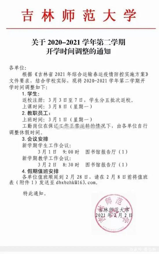 2月2日,吉林师范大学发布开学时间调整通知,学生返校时间为3月3日至7日,分五批次返校。