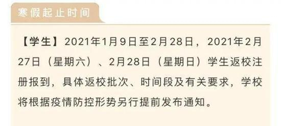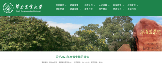 1月11日,华南农业大学官网发布《关于2021年寒假安排的通知》。《通知》中提到:根据校历,2020级本科生放假时间从 1月30日起至2月26日止,1月23日至1月29日为军训时间;其他年级本科生和研究生放假时间从 1月25日起至2月26日止。2月27、28日为开学注册时间,3月1日上课。