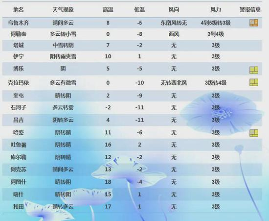 19日夜间到20日白天,伊犁州、博州西部、塔城地区北部、阿勒泰地区等地的部分区域有微到小雪,其中伊犁州北部、塔城地区北部、阿勒泰地区等地的部分区域有中到大雪,山区局地暴雪;上述区域伴有5级左右西北风,风口风力8~9级;气温下降5℃左右。全疆其它地区晴有时多云,风力不大。