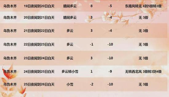 乌鲁木齐19日夜间到20日白天:晴间多云,气温8到-5度,东南风4到5级转3级。温馨提示:少扎堆不聚集,公勺公筷用起来。